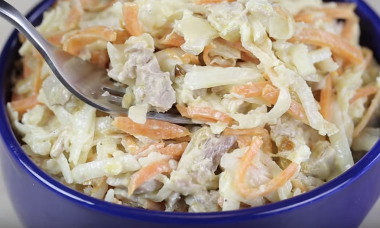 Сытный салат с мясом выходит настолько вкусным, что его часто просят повторять несколько дней подряд. Готовить же его элементарно — берем и смешиваем овощи с небольшим количеством свинины.