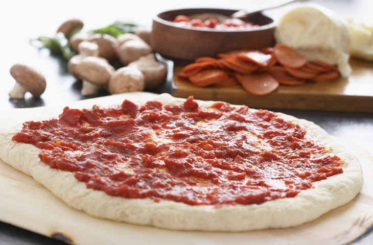 Теперь собственноручно сделанную лепешку необходимо смазать томатным соусом, и это должен быть не какой-нибудь кетчуп из магазина, а приготовленная своими руками паста из помидоров. Поверх нее выкладывают начинку. Продукты можно выбрать на свой вкус, главное, чтобы они сочетались между собой, а их общее количество не превышало 2-3 наименований. Если ингредиентов будет слишком много, потеряется баланс вкуса, к тому же, не исключено, что пицца не пропечется равномерно.