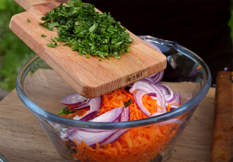 В миске смешайте обжаренные баклажаны и болгарский перец с измельченным чесноком, натертой на крупной терке морковью, нарезанным полукольцами луком и кинзой.