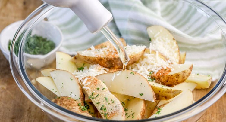 4. Переложите картофель в большую миску. Полейте 2 ст. л. оливкового масла и добавьте еще 1 ч. л. соли. Хорошо перемешайте дольки: накройте миску крышкой и слегка встряхните, чтобы каждая долька была покрыта маслом. При желании можно добавить специи: перец, паприку, сушеные травы.