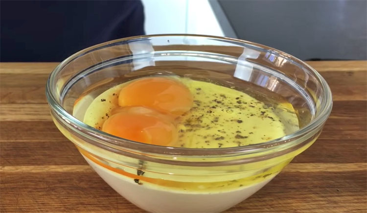 4. В глубокой миске смешиваем сметану с яйцами, добавляем соль и перец по вкусу. Каждую порцию заливаем приготовленной смесью.