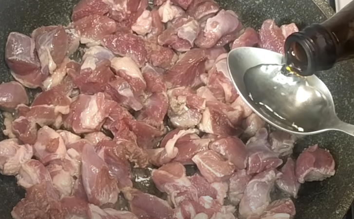 Разогреваем масло и перекладываем в сковороду нарезанное средними кусочками мясо. Распределяем его в один слой и сверху добавляем уксус. Перемешиваем, оставляем под крышкой до испарения жидкости.