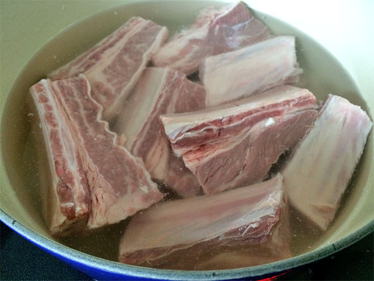 1. Бараньи ребра хорошо промойте под проточной водой. При желании разрубите на порционные куски. Положите ребрышки в кастрюлю, залейте холодной водой (2,5 л). Доведите до кипения на среднем огне. Снимите пенку, чтобы бульон получился прозрачным. Убавьте огонь и варите примерно 40–50 минут. Добавьте немного соли и перца, чтобы бульон не был пресным.