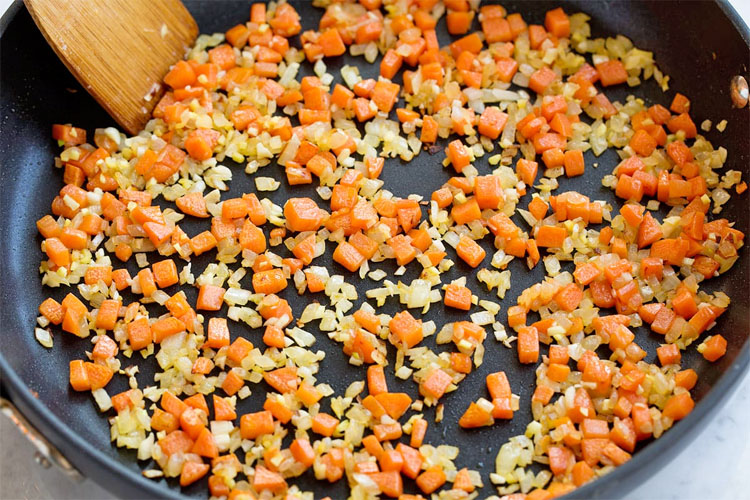 2. Лук и морковь очистите и нарежьте мелкими кубиками. В сковороде разогрейте растительное масло. Обжарьте лук и морковь 2–3 минуты до легкой золотистой корочки. Переложите овощи в кастрюлю с бульоном. Варите еще 10 минут.