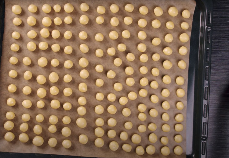 4. Выложите шарики на противень, застеленный бумагой для выпечки. Оставляйте между ними небольшие промежутки, так как они немного расплющатся во время выпекания. Разогрейте духовку до 180°C и выпекайте печенье 12–15 минут, пока оно не приобретет золотистый цвет. Не пережаривайте, иначе печенье может стать жестким.