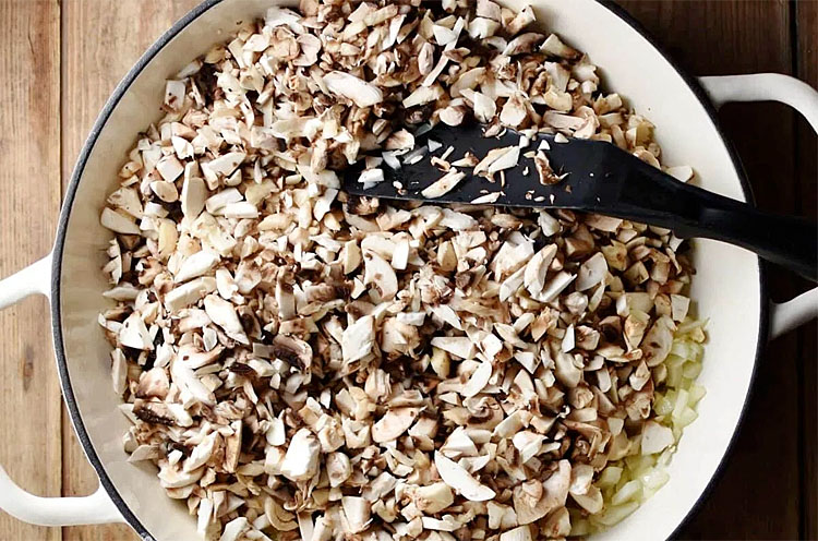 Режем мелко лук и грибы, а потом перемешиваем в миске. Следите за весом, его не должно быть больше, чем веса мяса. Обжариваем начинку на сковороде до золотистой корочке на луке. Теперь ее можно фаршировать.