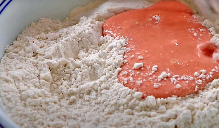 2. В большую миску просейте муку. Добавьте сухие дрожжи, соду, соль и при желании — сахар. Влейте томатную пасту небольшими порциями, одновременно замешивая тесто. Добавьте 1 ст. л. растительного масла для эластичности. Вымешивайте тесто 8–10 минут — оно должно получиться мягким, слегка липким, но держать форму.