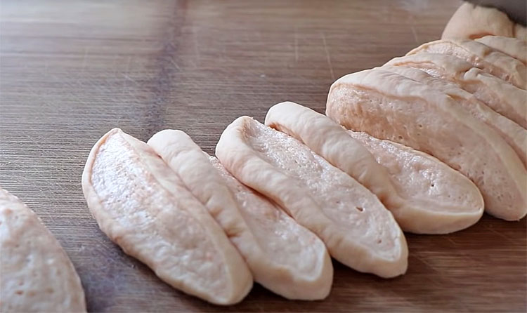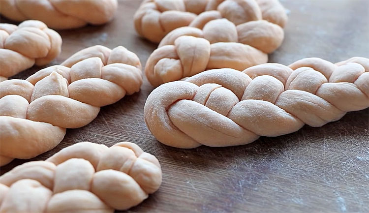 4. Подпылите рабочую поверхность мукой. Обомните тесто и разделите его на 10–12 равных кусочков. Из каждого сформируйте колбаску длиной около 20 см. Сверните в форму рогалика или кренделя (можно делать узелки, завитки и пряники — на ваше усмотрение). Выложите на противень, застеленный пергаментом.