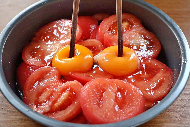 1. Помидоры вымойте и сделайте на каждом крестообразный надрез. Залейте их кипятком на 1–2 минуты, затем обдайте холодной водой — кожица легко снимется. Очищенные томаты нарежьте кубиками, переложите в чашу блендера и добавьте яйца. Измельчите до однородной массы — должна получиться густая томатная паста.