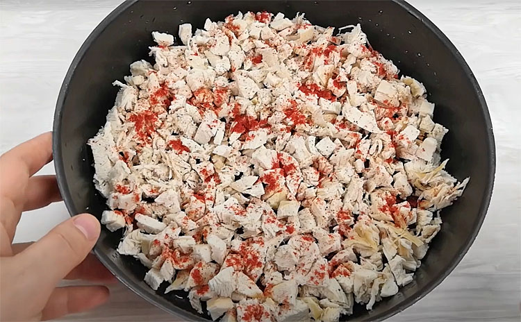 1. Нарежьте отварную куриную грудку небольшими кусочками (примерно 2–3 см), чтобы они легко пропеклись и сочетались с овощами. При желании можно слегка поперчить и посыпать паприкой прямо перед выкладкой.