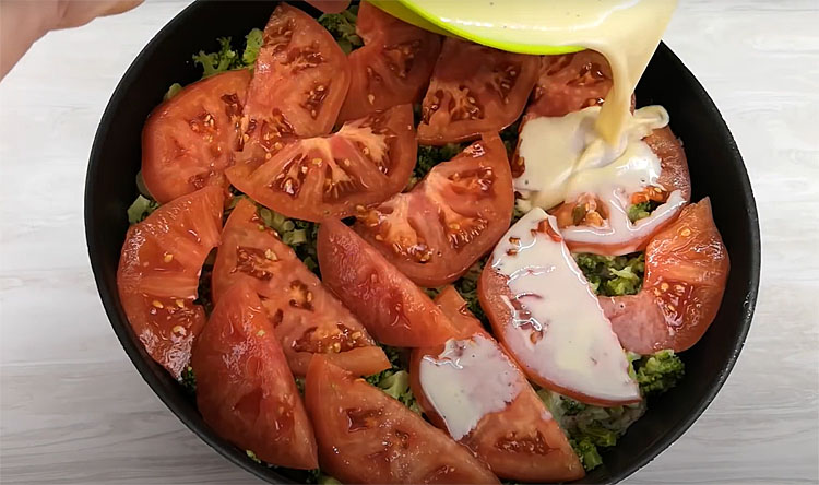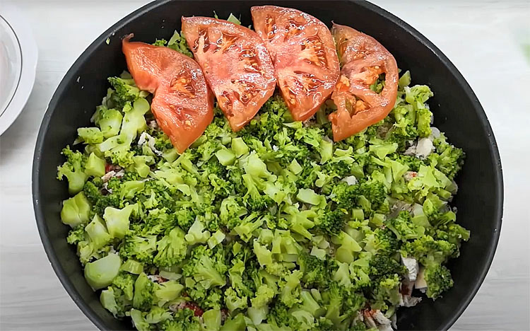 2. Брокколи разделите на небольшие соцветия, сопоставимые по размеру с кусочками курицы. Помидоры нарежьте средними кусочками или дольками. Можно удалить семена, чтобы запеканка была менее водянистой.