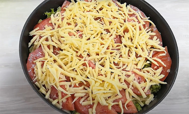 5. Равномерно посыпьте сверху тёртым сыром. Поместите форму в разогретую духовку до 180°C и запекайте 25 минут до золотистой корочки. Сыр должен расплавиться и слегка подрумяниться, создавая аппетитную корочку.