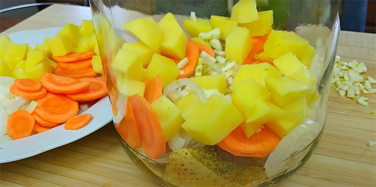 3. Возьмите чистую и сухую трёхлитровую стеклянную банку без сколов и трещин. На дно выложите часть курицы, стараясь распределить куски равномерно. Сверху добавьте немного лука, моркови и картофеля, затем посыпьте частью чеснока.