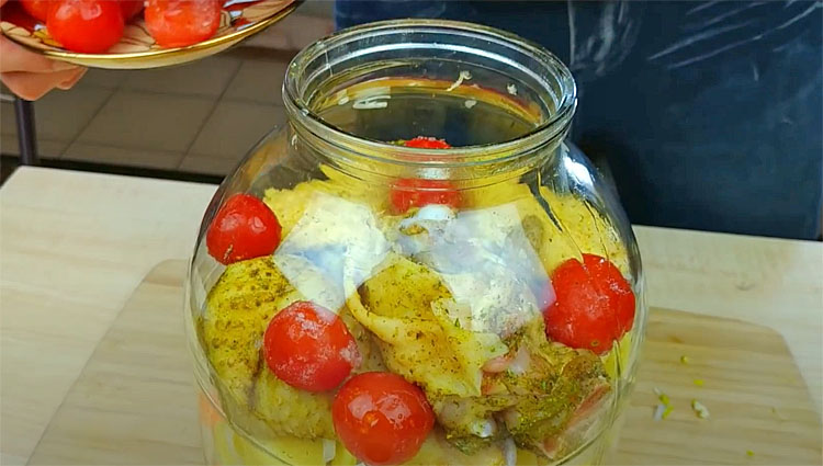 4. Продолжайте укладывать продукты слоями: курица, овощи, чеснок. Слои можно слегка прижимать, но не утрамбовывать слишком плотно — внутри должно оставаться немного пространства для циркуляции пара. Когда банка почти заполнится, выложите сверху помидоры. Если используете черри, кладите их целиком; крупные помидоры лучше нарезать дольками. Они дадут сок и добавят блюду лёгкую кислинку.