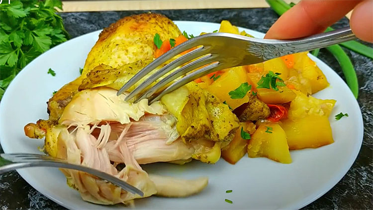 6. Включите духовку и разогрейте её до 180 °C. По мере нагрева курица и овощи начнут выделять сок, и блюдо будет готовиться в собственном пару. Готовьте примерно 1,5–2 часа. За это время курица станет мягкой, а овощи полностью пропитаются соками и специями.