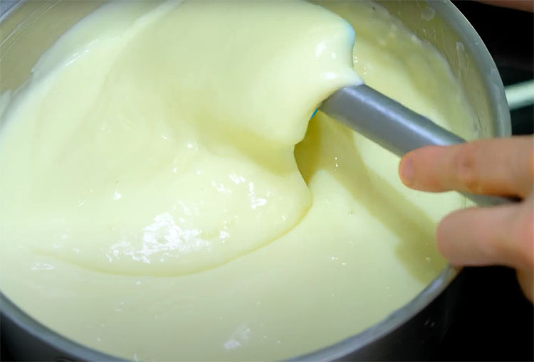 Переливаем все в кастрюлю, и варим до загустения. Выстилаем форму пищевой пленкой, сверху выкладываем крем и накрываем сверху еще одним листом пленки. Пусть остывает при комнатной температуре.