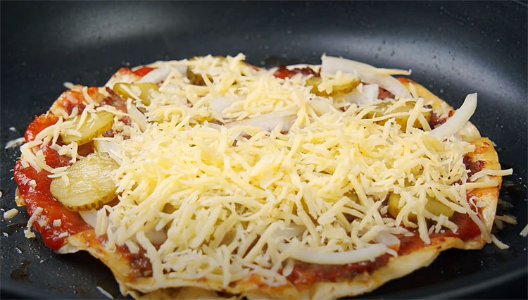 Разогрейте сковороду с небольшим количеством масла на среднем огне. Выложите лаваш с фаршем на сковороду фаршем вниз. Обжаривайте 3 минуты, пока фарш не начнет подрумяниваться. Аккуратно переверните лаваш. Сверху смажьте кетчупом, выложите лук, огурцы и посыпьте сыром.