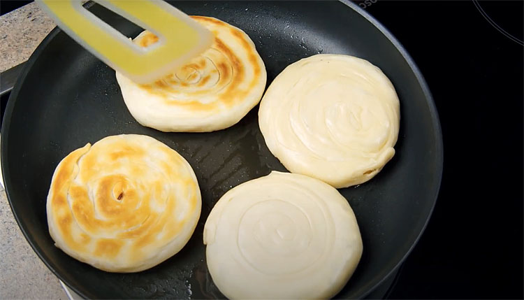Разогрейте сковороду на среднем огне, накройте крышкой и жарьте лепешки по 10 минут с каждой стороны до золотистой корочки. Лук внутри должен быть мягким и сочным.