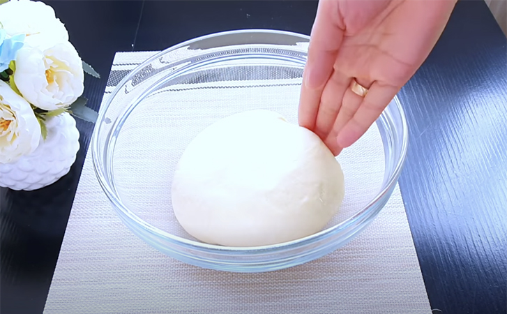Сначала основное, замешаем простое тесто. В глубокой миске смешиваем 250 миллилитров воды, яичный желток, 2 столовые ложки растопленного сливочного масла, половину чайной ложки соли и вводим 380 граммов муки. Тесто получится достаточно плотным и эластичным, оставьте его под крышкой на 20 минут.