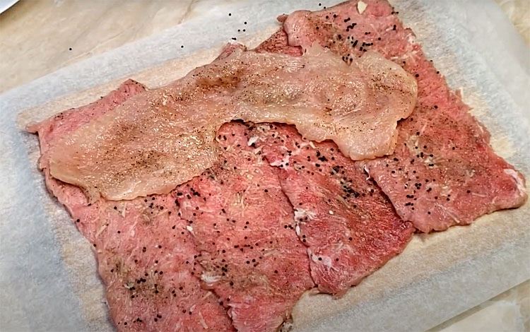2. Перемешайте соль и перец, чтобы равномерно распределить по мясу. Посолите и поперчите каждый кусочек свинины и курицы с обеих сторон. Это важно для того, чтобы вкус был равномерно распределен по всему рулету. Также добавьте свежемолотый черный перец, если хотите усилить аромат.