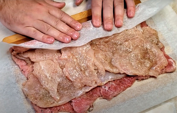 3. Разложите мясо на пергаментной бумаге, застелив рабочую поверхность. Важно выкладывать мясо внахлест, чтобы рулет получился плотным и не разваливался при запекании. Тонкие слои свинины и куриного филе должны покрывать друг друга, образуя единую структуру. Натертый на мелкой терке чеснок равномерно распределите по всей поверхности мяса. Чеснок придаст рулету аромат и легкую остринку. После этого, на свинину аккуратно уложите кусочки куриного филе поперек, так, чтобы они заполнили все пространство.
