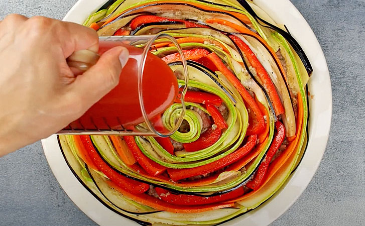 6. С помощью кисточки покройте поверхность запеканки чесночным соусом. Равномерно залейте запеканку 150 мл томатного сока. Разогрейте духовку до 180°C. Поставьте форму с запеканкой в духовку и запекайте 50 минут.