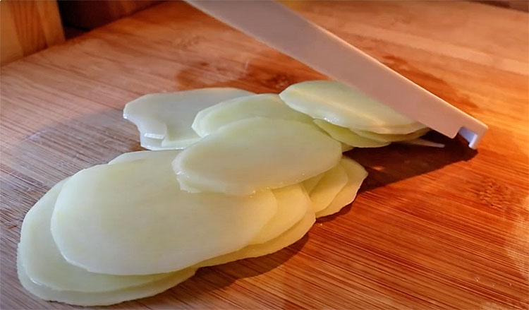 1. Картофель тщательно вымойте, при желании очистите от кожуры и нарежьте очень тонкими кружками или слайсами. Чем тоньше будет нарезка, тем быстрее и равномернее картофель приготовится. Удобнее всего использовать терку для корейской моркови, но можно нарезать и острым ножом.