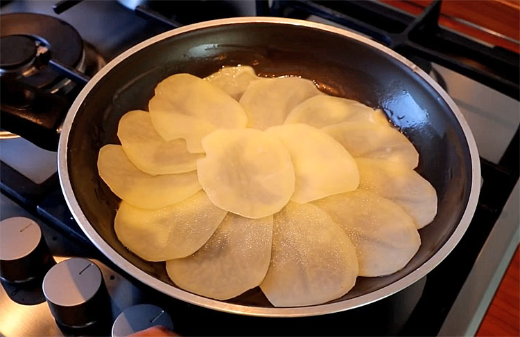 2. Поставьте сковороду на средний огонь, добавьте сливочное масло и дайте ему полностью растопиться. Когда масло равномерно покроет дно, выложите картофель в один слой, слегка посолите и поперчите, накройте крышкой и оставьте жариться примерно на 5 минут, чтобы картофель стал мягким и начал подрумяниваться снизу.