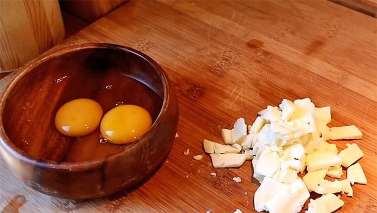3. Пока готовится картофель, нарежьте сыр крупными кусочками или натрите его на крупной терке — ориентируйтесь на то, как вы любите, чтобы он распределялся в блюде. В отдельную миску разбейте яйца, добавьте щепотку соли и взбейте вилкой до однородности, не добиваясь пышной пены.