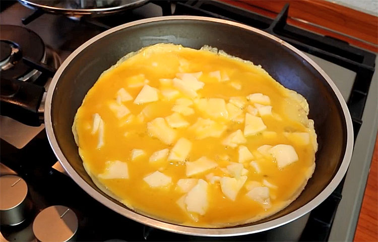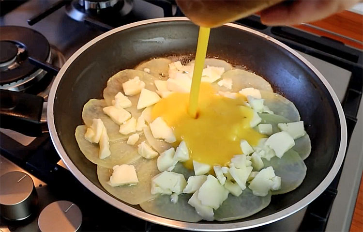 4. Снимите крышку со сковороды и равномерно разложите сыр поверх картофеля, стараясь покрыть всю поверхность. Сразу после этого аккуратно залейте картофель взбитыми яйцами, чтобы масса заполнила пространство между ломтиками и связала все ингредиенты.