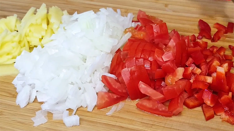 1. Нарежьте мелко картофель, лук, помидоры и болгарский перец. Промойте рис до прозрачности воды.