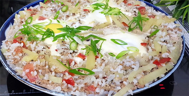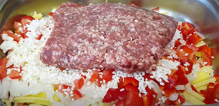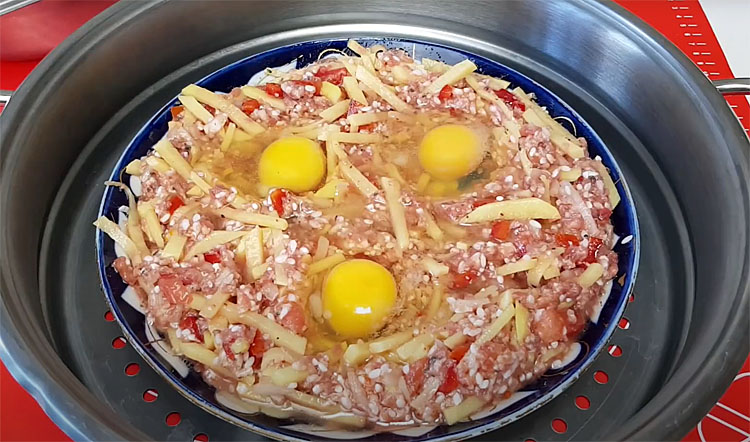 Обычно из фарша готовят котлеты, которые требуют обязательной жарки. Но мы сделаем намного проще и быстрее: вместо того чтобы жарить фарш с картошкой, помидорами и рисом, мы просто выложим смесь, разобьём сверху яйца и приготовим всё на пару.