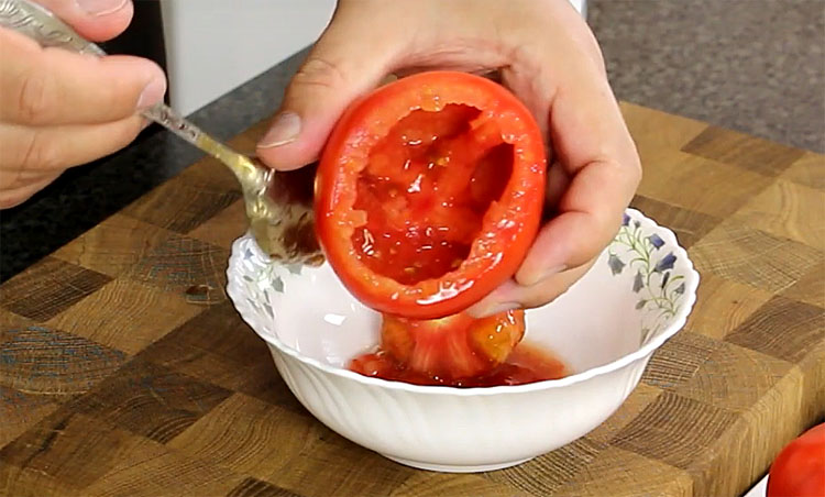 1. Разбейте яйца в маленькую миску и тщательно взбейте их вилкой. Добавьте соль и перец, затем снова перемешайте. Оставьте их пока в стороне. Вымойте помидоры и острым ножом срежьте верхушки помидоров, создавая «крышечки». Ложкой аккуратно удалите большую часть мякоти из каждого помидора, оставив стенки толщиной около 1 см. Подготовленные помидоры поставьте на тарелку, готовую для микроволновки.