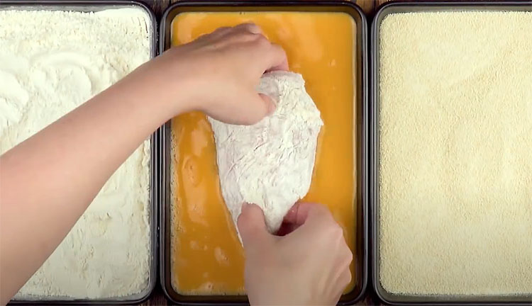 2. Обваляйте каждую грудку в муке со всех сторон, стряхивая излишки. Взбейте яйца вилкой и обмакните грудку полностью, чтобы мука прилипла равномерно. Обсыпьте панировочными сухарями, слегка прижимая их руками, чтобы слой был плотным и ровным. Для хрустящей корочки можно смешать сухари с небольшим количеством тертого пармезана или специй.