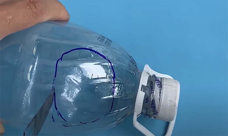 1. Очистите бутылку от этикеток и хорошо промойте. Вырежьте круг возле горлышка диаметром около 2–3 см. Это отверстие для шланга, через который будет поступать вода. Можно сделать пару дополнительных маленьких отверстий в крышке, чтобы воздух проходил и вода лучше распределялась.