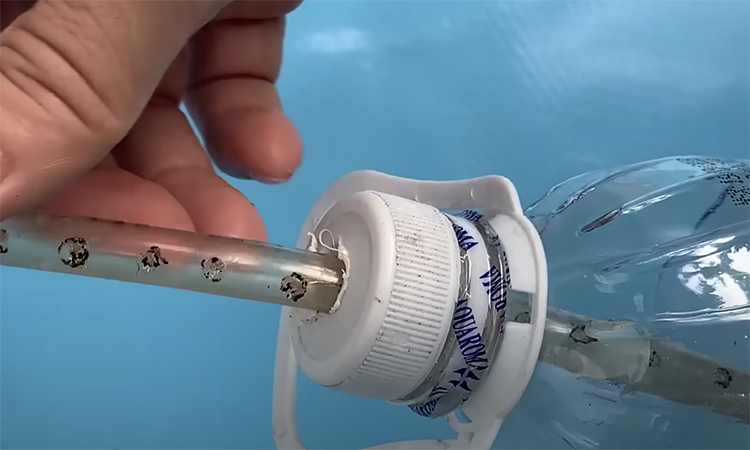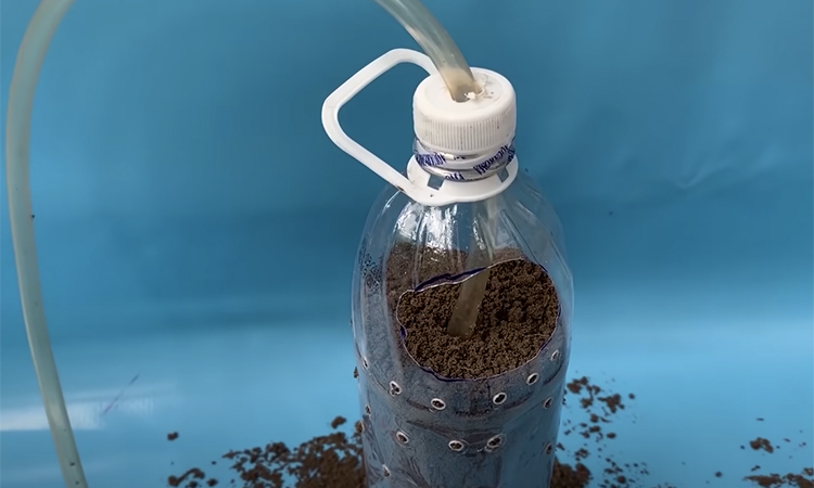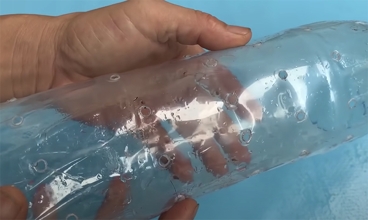 3. Сделайте небольшие отверстия по всей длине шланга, через который будет поступать вода. Вставьте шланг через горлышко бутылки, расправив его внутри так, чтобы отверстия располагались возле каждого растения.
