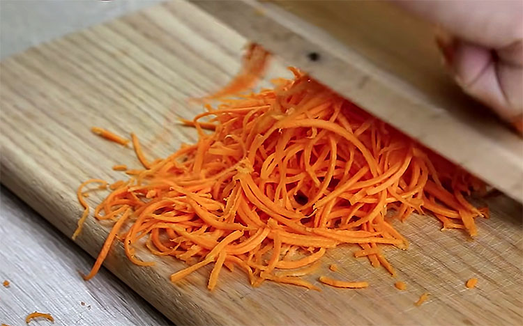 2. Морковь очистите и натрите на крупной терке. Если морковь слишком крупная, ее можно слегка порезать ножом, чтобы кусочки были примерно 3–5 мм.