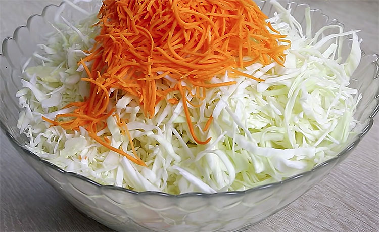 3. Смешайте морковь с нашинкованной капустой. Обминание и подготовка к засолке В глубокой миске тщательно обомните капусту с морковью руками. Давите до тех пор, пока смесь не начнет выделять сок. Это важно — сок образует естественную среду для ферментации. Добавьте соль крупного помола и равномерно распределите её по всей массе. Соль не только придает вкус, но и способствует мягкому брожению.