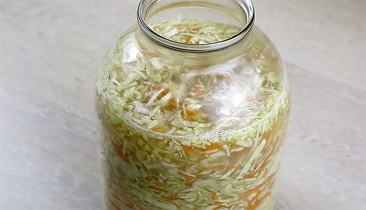 5. Оставьте банку при комнатной температуре (20–25 °C). Через 12 часов капуста выделит сок, покрывающий овощи. Если сока мало, можно слегка придавить капусту сверху. Накройте банку крышкой, но не закрывайте герметично — во время брожения выделяется газ.