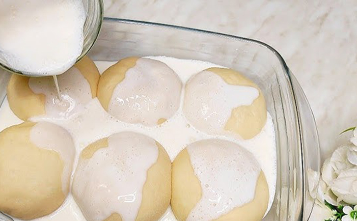 Затем сворачиваем тесто в булочку и выкладываем в форму для запекания. Быстро делаем простую молочную заливку: 100 миллилитров молока взбиваем с чайной ложкой нейтрального греческого йогурта. Получившейся массой заливаем заготовки.