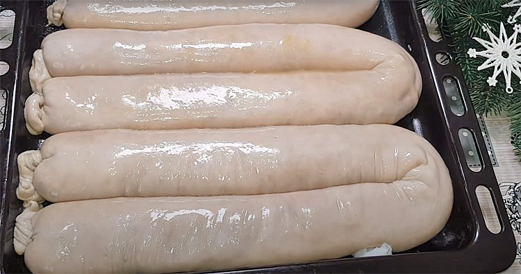 6. Противень смажьте растительным маслом или растопленным жиром, чтобы колбаса не прилипла и подрумянилась равномерно. Аккуратно выложите заготовки на противень.