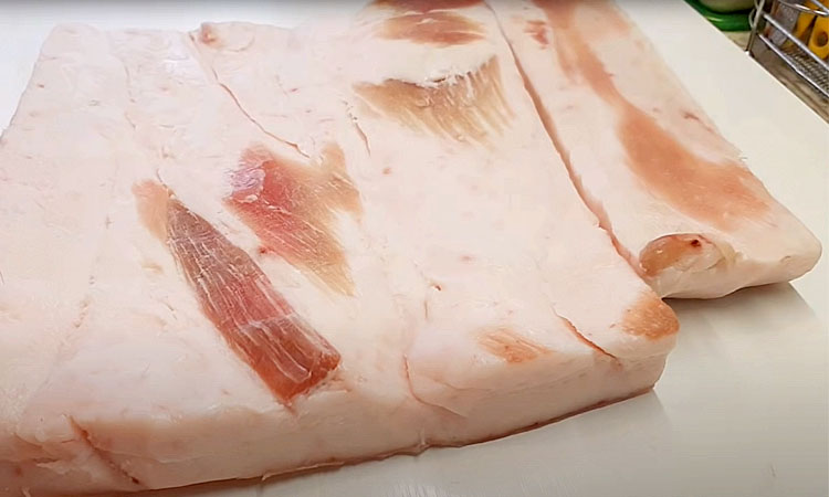 3. После засолки промойте каждый кусочек сала под холодной водой, чтобы удалить излишки соли. Вы можете дополнительно вымочить сало в холодной воде на несколько часов, если оно слишком соленое. Отложите чеснок, так как он пригодится для начинки.
