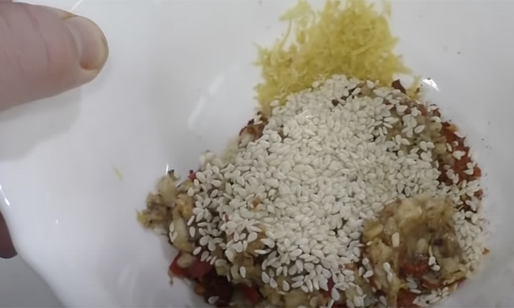 Теперь делаем ароматное масло: в глубокую миску натираем цедру с одного лимона, чайную ложку острого чили, копченую паприку. В ступке толчем вместе сычуаньский перец (можно заменить и обычным черным в зернах), мелко нарезанный острый свежий перец чили, 5 зубчиков чеснока, мелко нарезанный имбирь. Перекладываем получившуюся массу в миску к цедре. Добавляем туда же немного кунжута, перемешиваем.