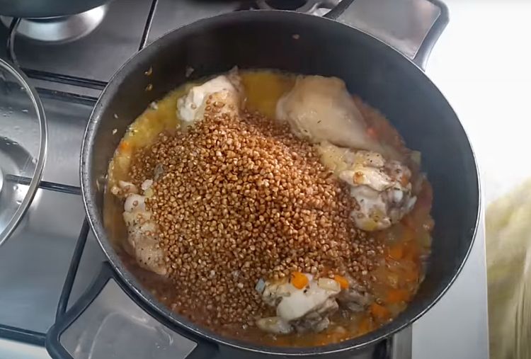 Теперь засыпаем гречку к курице, доливаем еще примерно литр воды и тушим теперь уже до готовности гречневой крупы.