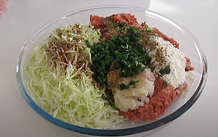 2. Мелко нашинкуйте капусту и лук, чеснок измельчите. В большой миске соедините фарш, капусту, лук, чеснок, яйца, растительное масло и специи. Добавьте пшеничную муку и тщательно перемешайте массу руками или ложкой до однородности. Проверьте вкус, при необходимости досолите или добавьте перец.