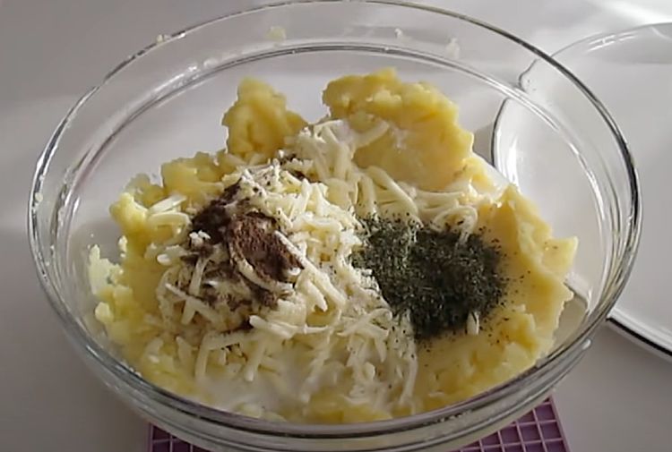 4. Разомните отварной картофель в пюре с помощью толкушки или миксера. Добавьте тертый сыр и молоко, тщательно перемешайте. Посолите, поперчите и добавьте щепотку любимых специй (например, мускатный орех или петрушку).