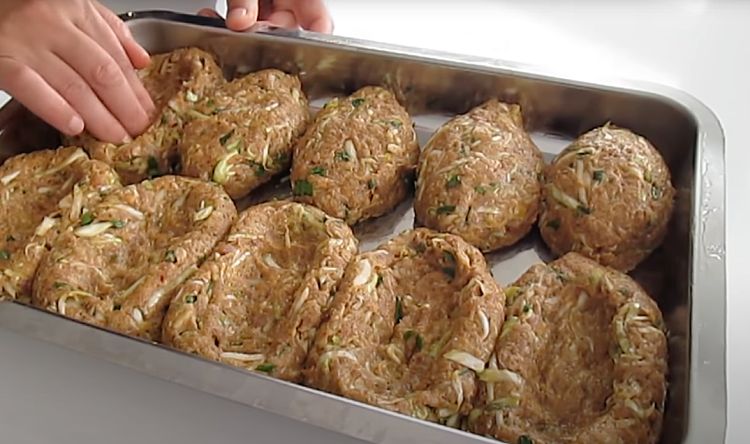 3. Разогрейте духовку до 220 °C. Сформируйте из фарша фрикадельки размером с большой грецкий орех или чуть больше (по желанию). В каждой фрикадельке сделайте углубление ложкой или пальцем — в него будет укладываться пюре. Выложите фрикадельки в смазанную маслом форму для запекания, оставляя небольшое пространство между ними. Поставьте форму с фрикадельками в разогретую духовку. Запекайте 35 минут, чтобы фарш слегка подрумянился и капуста в фрикадельках стала мягкой.