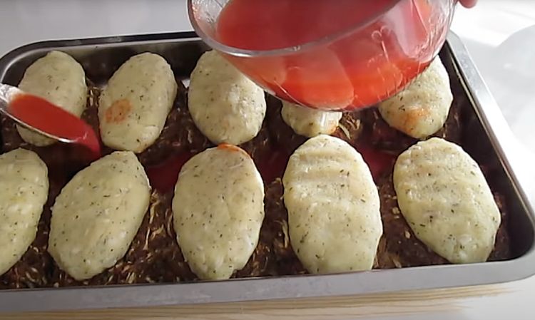 6. В небольшой миске разведите томатную пасту в воде, чтобы получился однородный соус. Залейте фрикадельки соусом так, чтобы покрыть дно формы и слегка обволакивать фрикадельки.