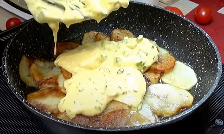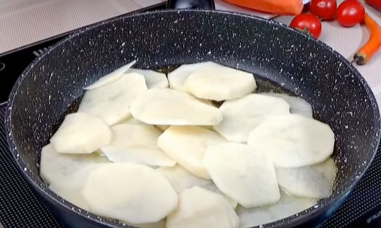 1. Очистите картофель и нарежьте его средними пластинами (примерно 0,5 см толщиной). Разогрейте сковороду с 1–2 ст. л. масла на среднем огне. Выложите картофель одним слоем и обжаривайте, периодически переворачивая, до золотистой корочки с обеих сторон (около 5–7 минут). Готовый картофель переложите на отдельную тарелку, чтобы он не мешал дальнейшему приготовлению.