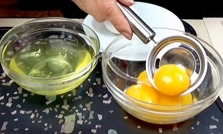 4. Разбейте 5 яиц и аккуратно отделите белки от желтков. Вылейте белки в чашу блендера, добавьте 1 чайную ложку соли. Взбейте до легкой пены (не обязательно до жестких пиков).